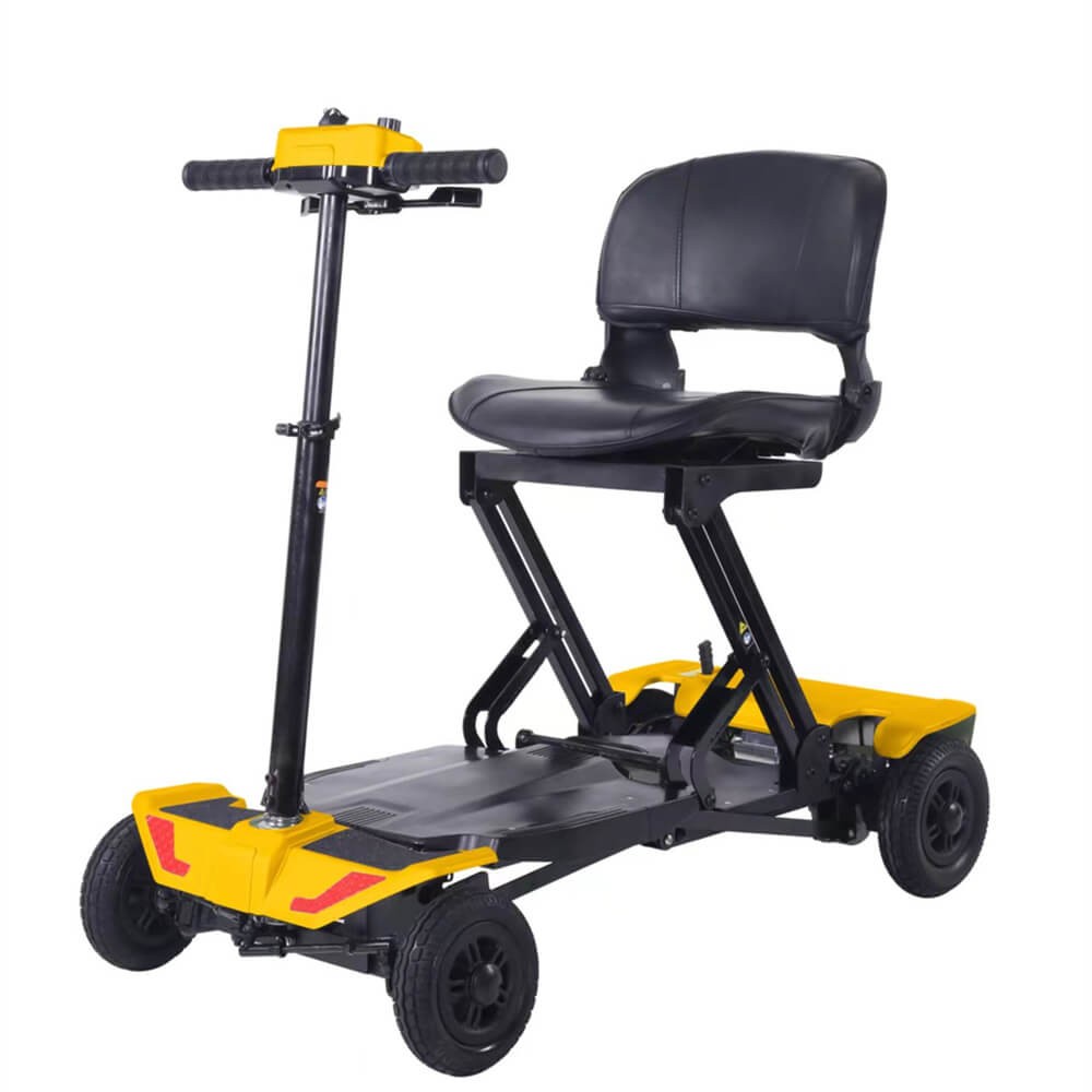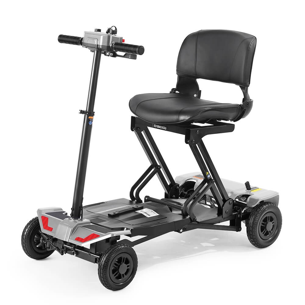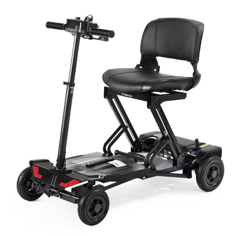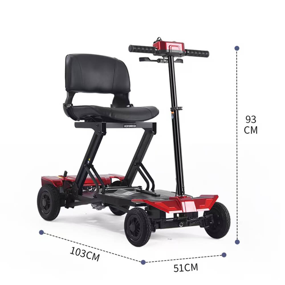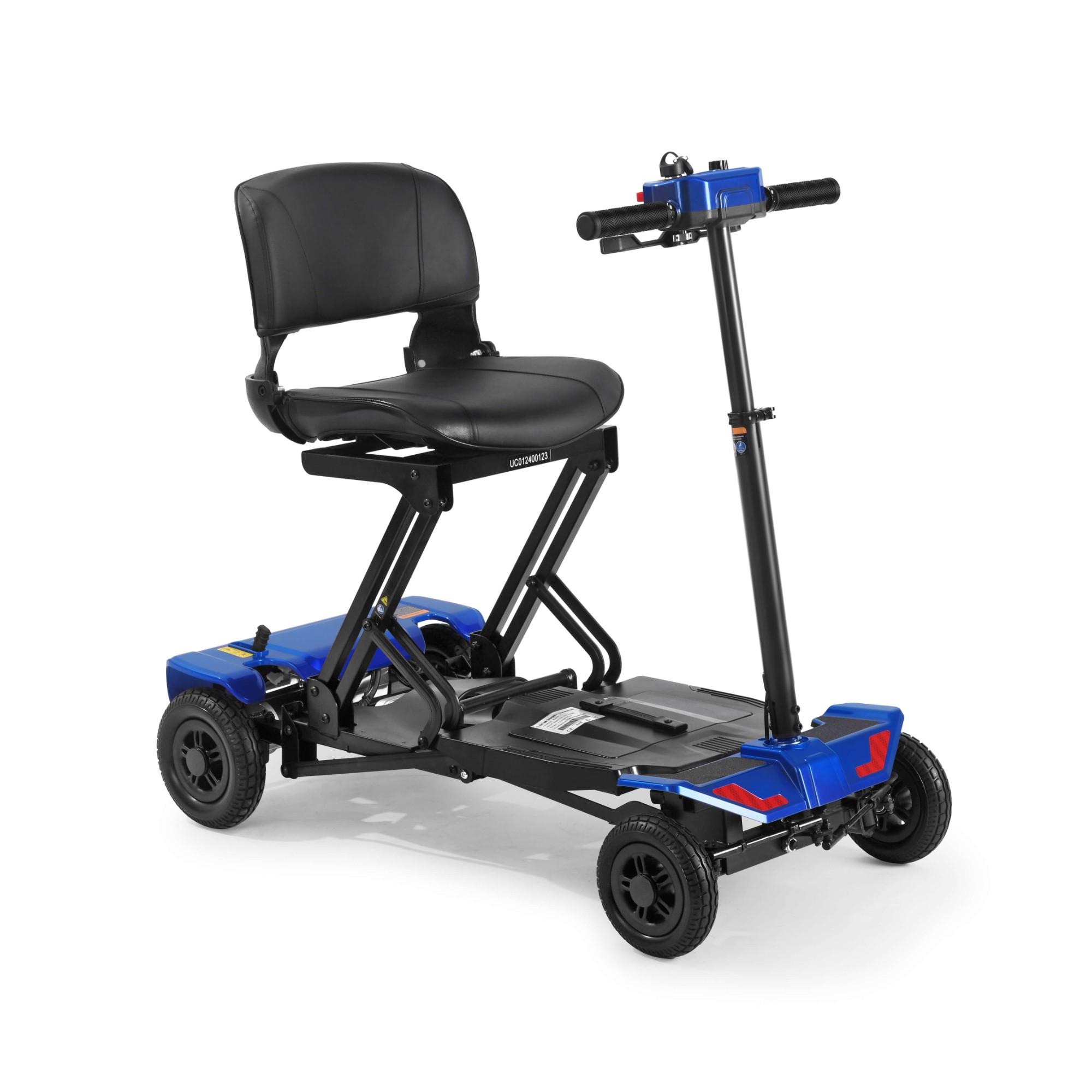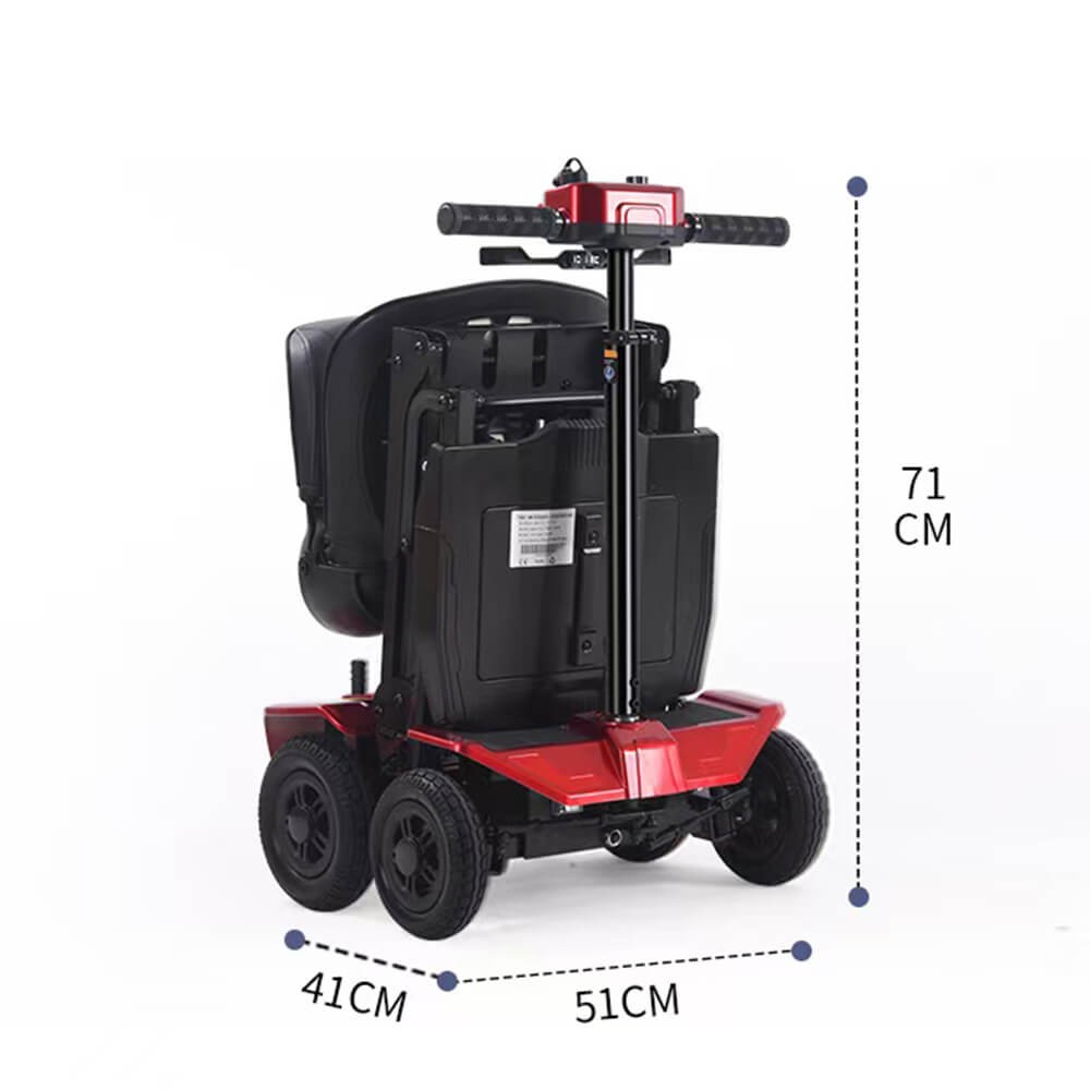 Der RMS-101 ist ein Elektromobil mit einer Geschwindigkeit von 6 km/h, das sich per Knopfdruck in Sekundenschnelle zusammenfalten lässt. Die Reichweite beträgt bis zu 15 km. Er ist in Rot oder Blau erhältlich und bietet verschiedene optionale Extras, darunter eine Rücksitztasche und eine externe Ladestation.