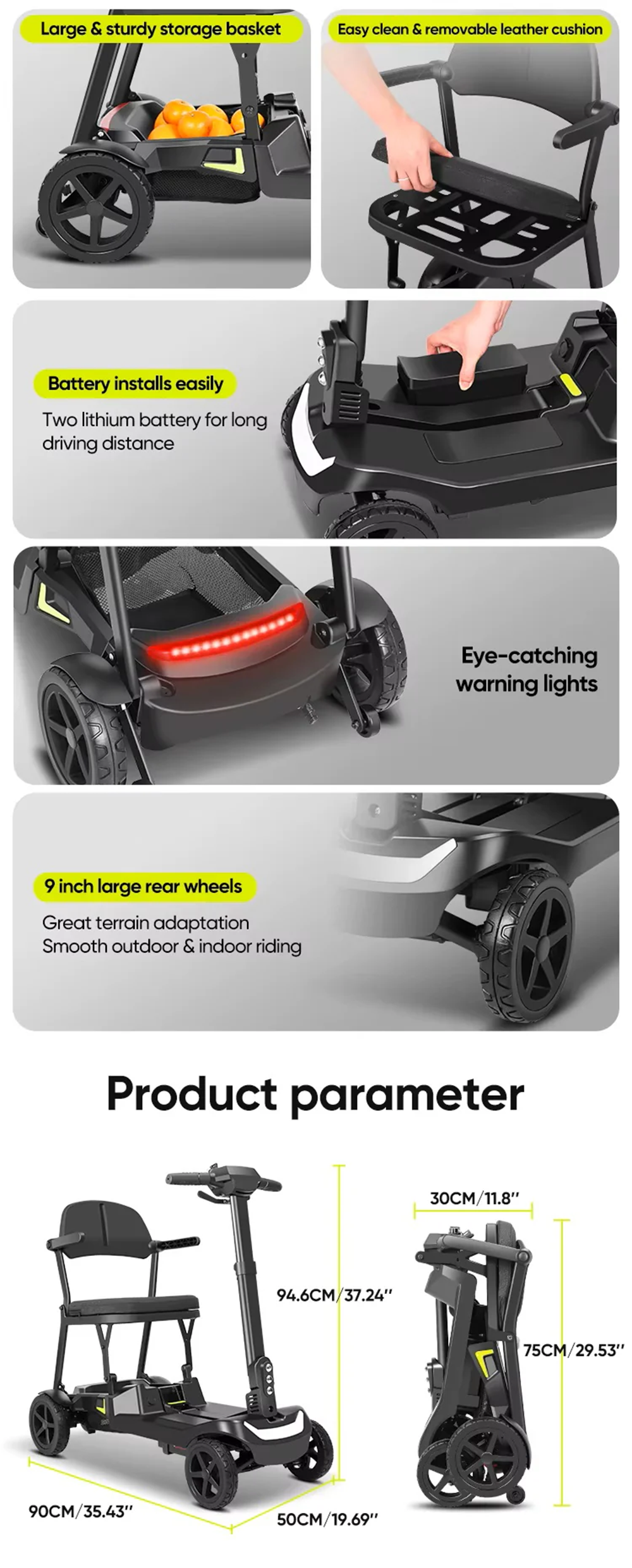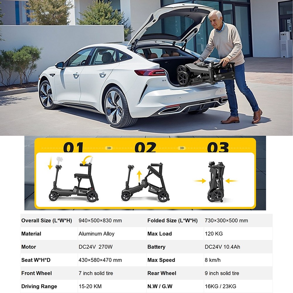 Der RM-985S ist ein 8 km/h schneller Elektromobil, der sich in Sekundenschnelle zusammenklappen lässt. Er hat eine Reichweite von bis zu 15 km und ist in verschiedenen Farben erhältlich. Kompakt, leicht und tragbar – ideal für den täglichen Gebrauch.